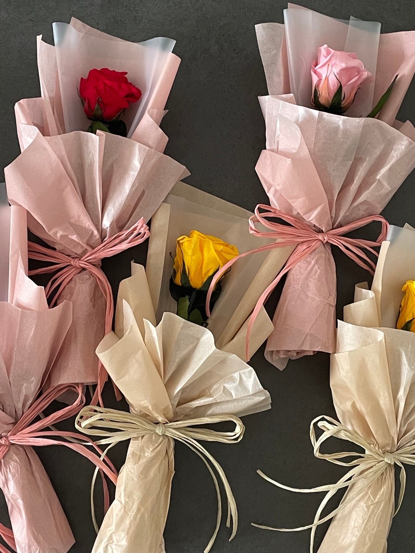 鮮やかな4色展開のピンク、イエロー、ブルー、レッドの中からお好みの色をお選びいただけます。かわいらしい1本バラは、贈り物やインテリアとしても最適です。大切な記念日や特別な日に、ぜひお使いください。